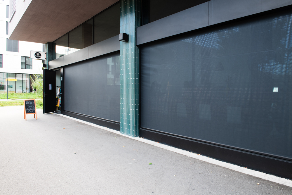 Der Raum ist hell und barrierefrei. Die Fenster können mittels Storen abgedunkelt werden. Die Storen bieten bei Tageslicht auch einen optimalen Sichtschutz.