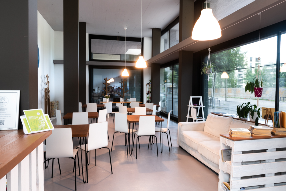 Unser grosser Raum ist mit zwei Sofas (können bei Bedarf verstaut werden), 6 Holztischen 80x80cm, 24 Stühlen und einem grossen Tisch bestückt.